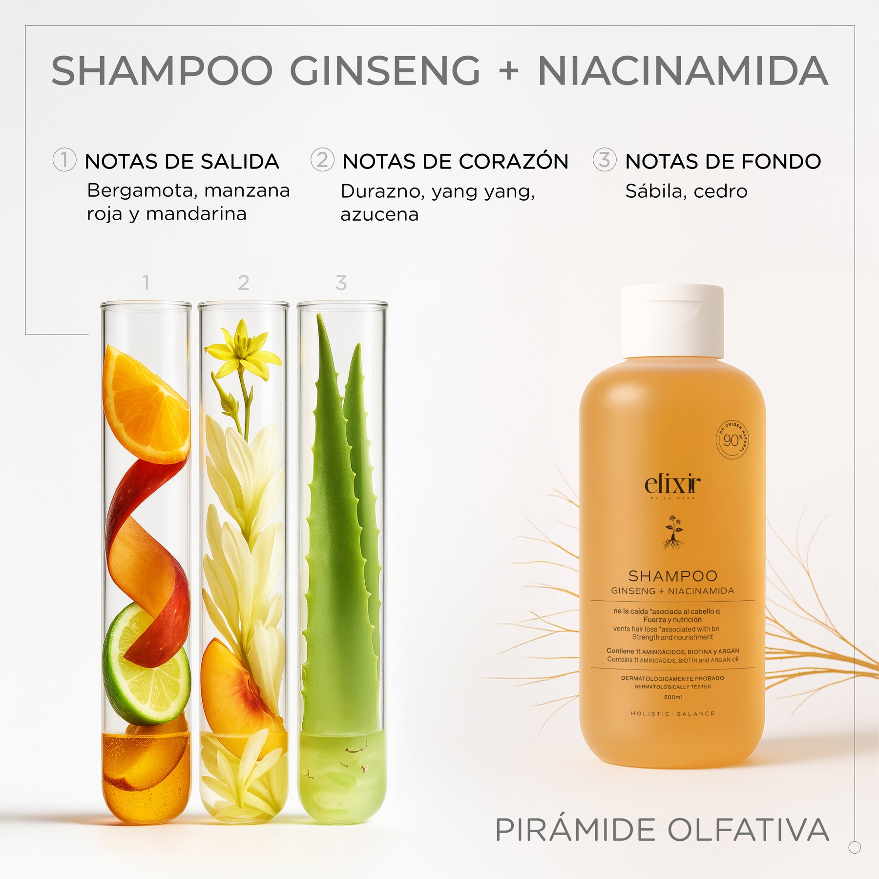 Este shampoo tiene un 90% de ingredientes naturales, entre los que destaca el Ginseng, nuestro shampoo limpia profundamente de raíz a puntas, mientras nutre y promueve el crecimiento de tu cabello, complementándose con la niacinamida que, además, combate la caída y repara el daño causado por otros agentes externos.