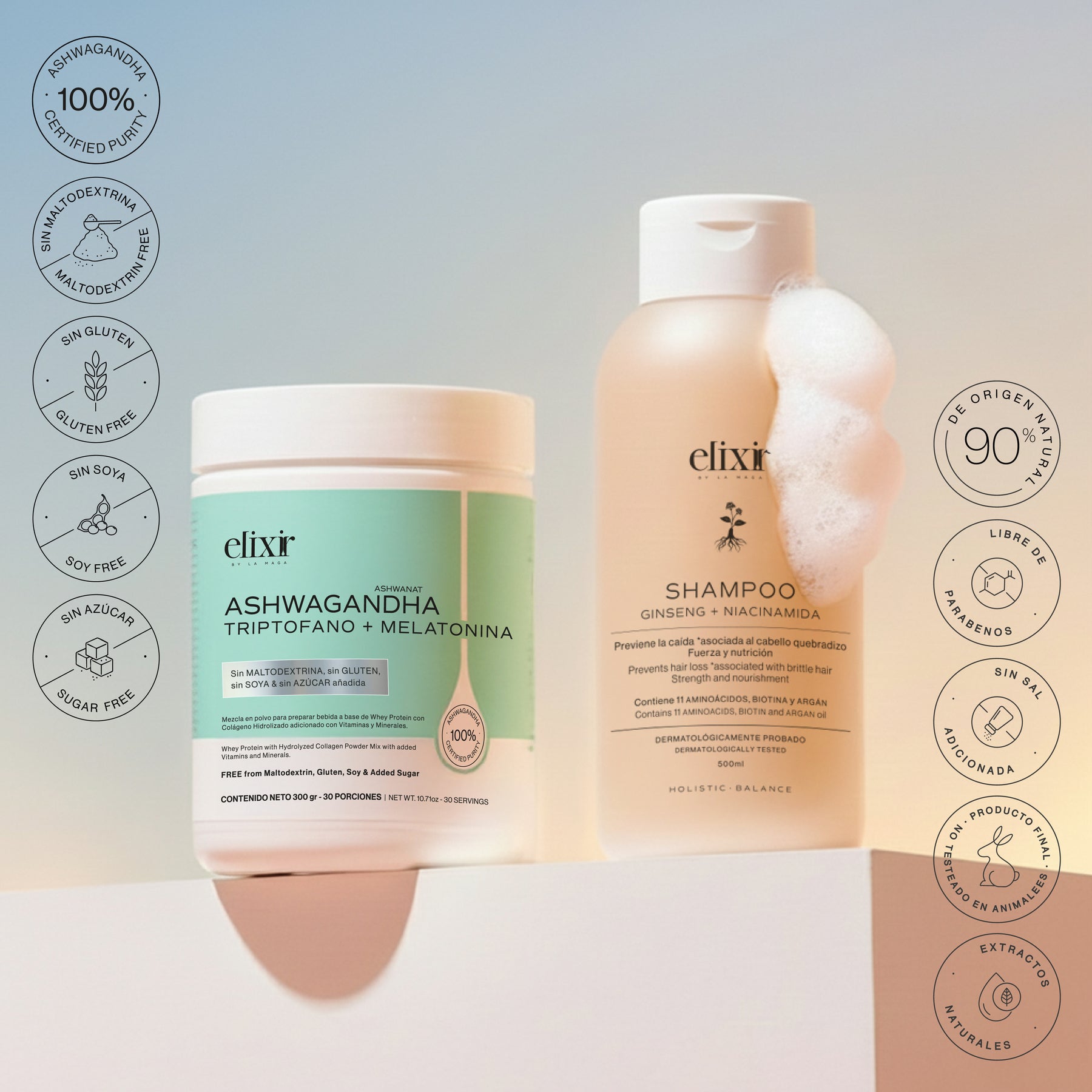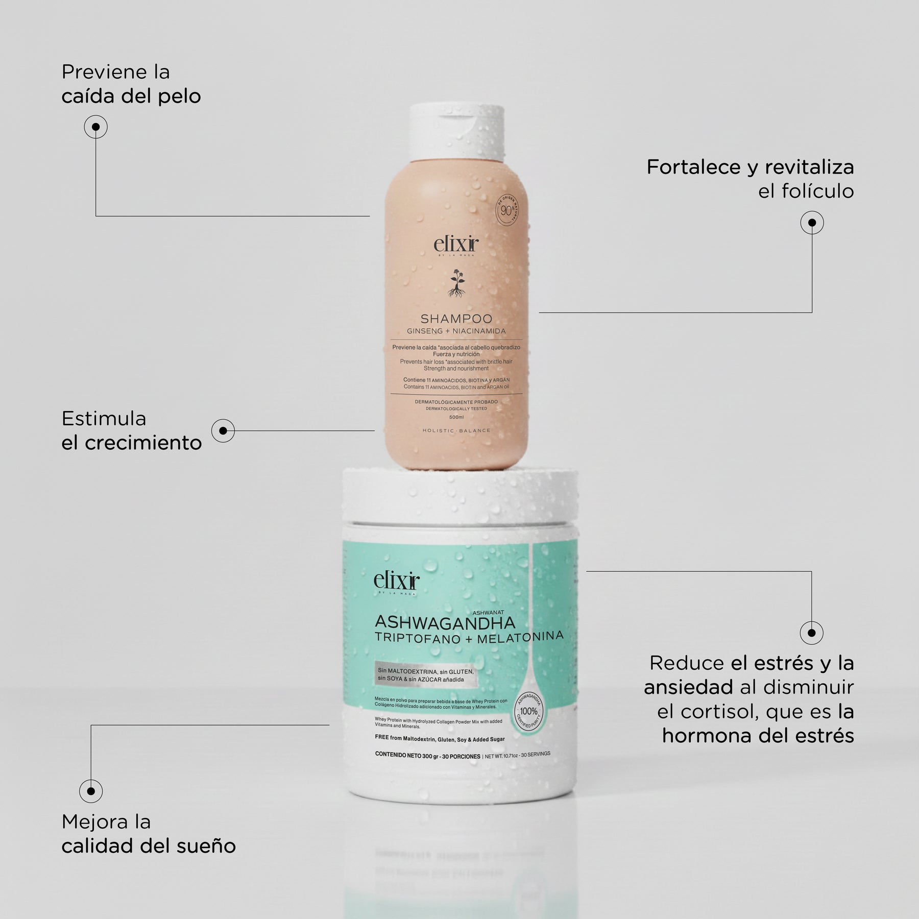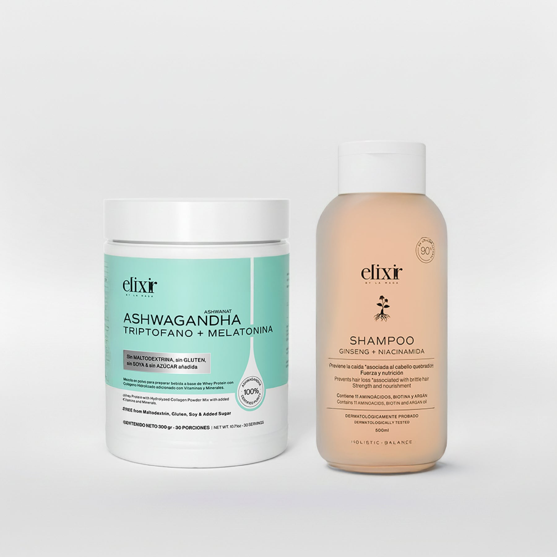 El estrés es una de las principales razones de caída del cabello, este kit combina el poder de dos raíces ancestrales que desde épocas milenarias han sido usadas por sus amplios beneficios para devolverle la calma a tu vida y fortalecer tu pelo desde la raíz.