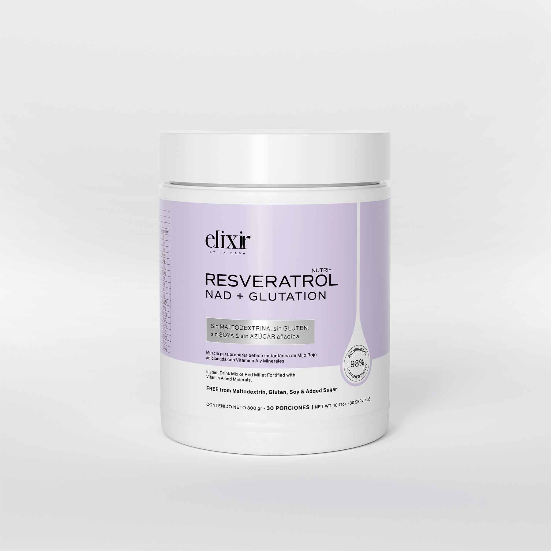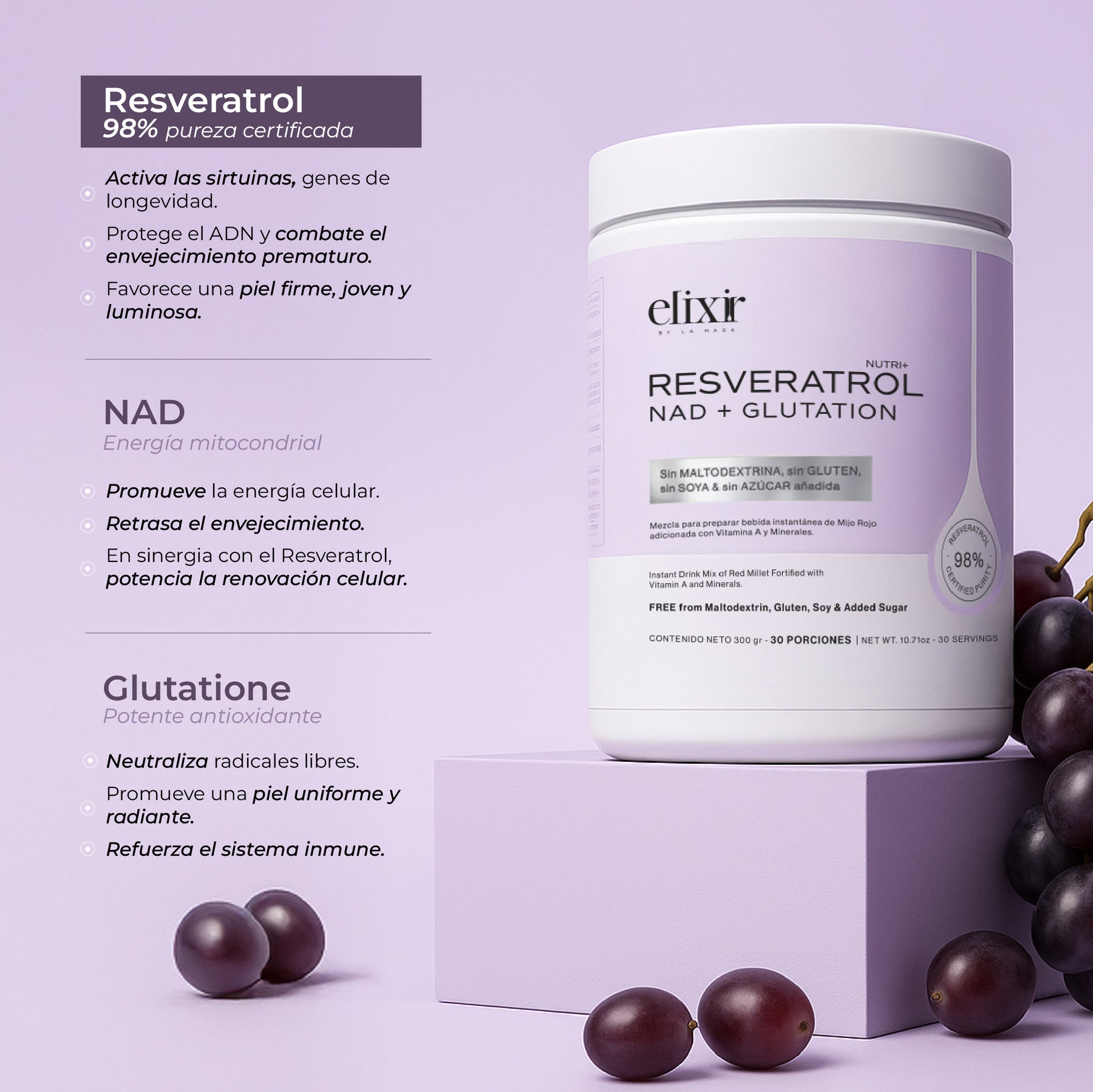 Este fitonutriente a base de mijo rojo, tiene como ingrediente principal el Resveratrol, con una pureza certificada del 98% y lo potencia con el NAD y Glutation. Protege las células del daño oxidativo, previene el envejecimiento prematuro y favorece una piel joven, firme y luminosa, mientras fortalece el bienestar general.
