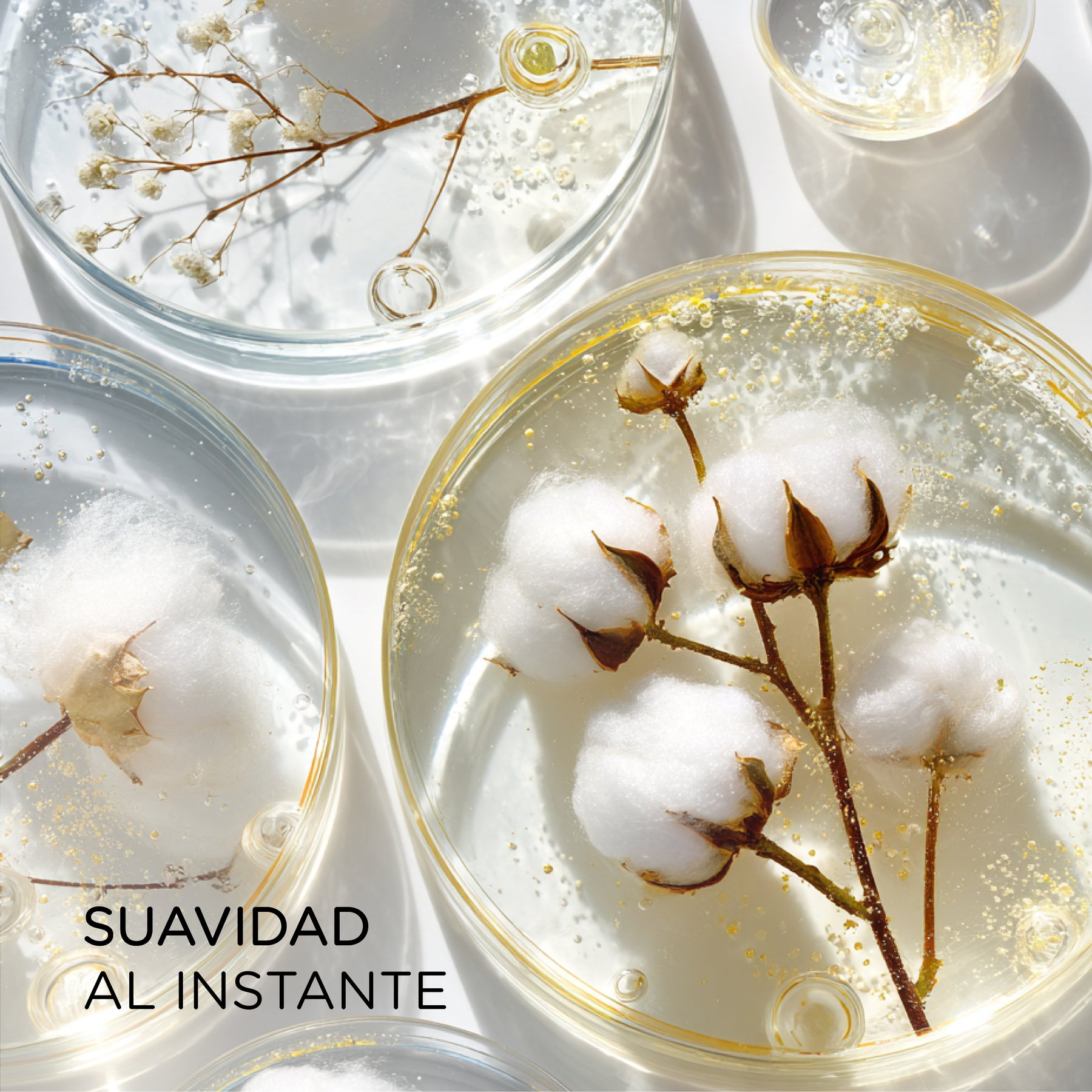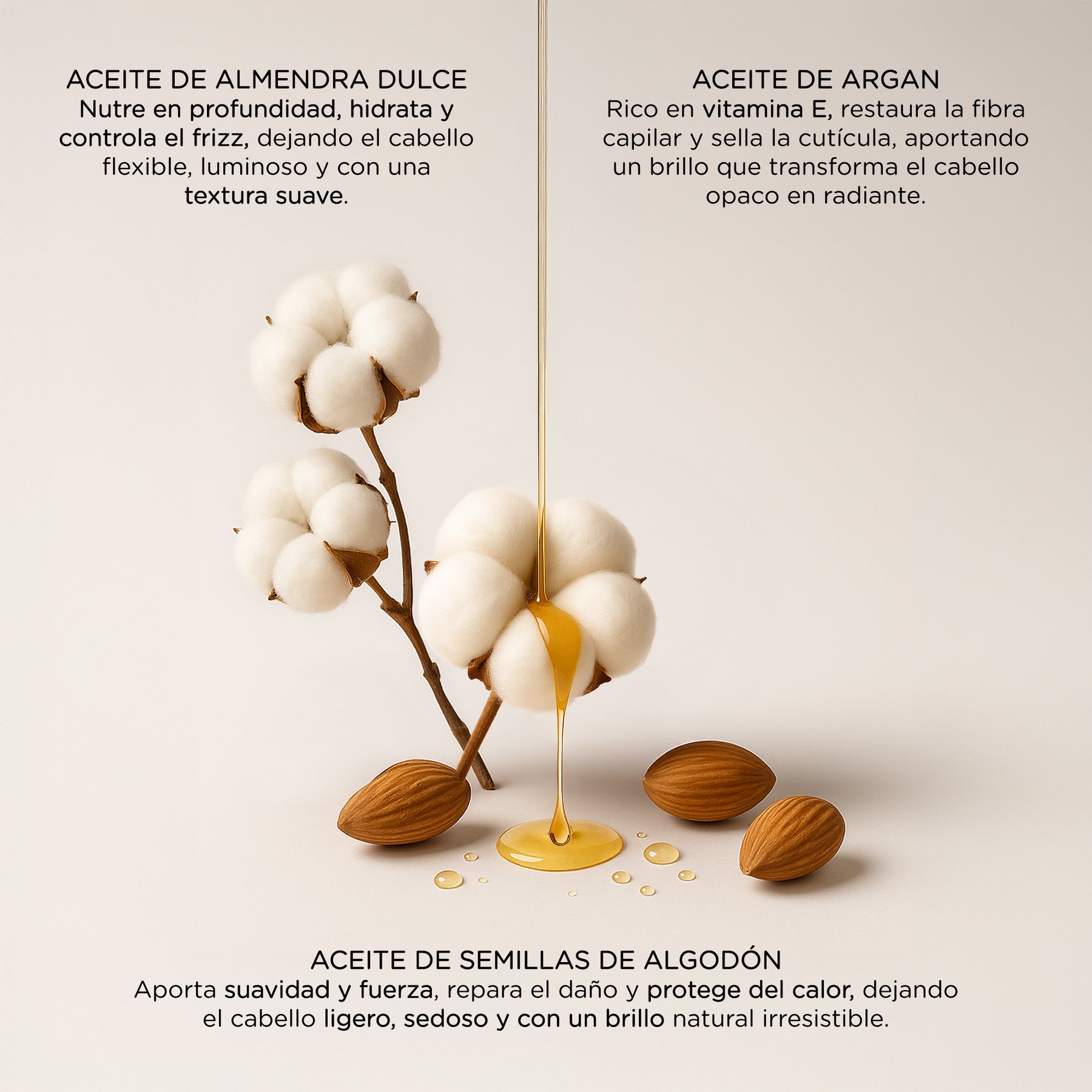 Aceite de semilla de algodón: Nutre, hidrata y fortalece la cutícula capilar, previniendo quiebres.